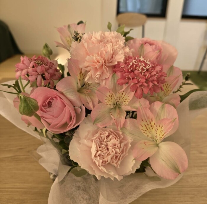 参加された皆様は、お花の高さやグリーンの配置をあれこれ悩んでおられましたが、春を先取りしたような、可愛らしいふんわりとした印象のピンクのフラワーアレンジの仕上がりに、大変満足していただけたように思います。