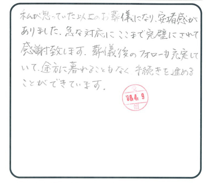 私が思っていた以上のお葬儀になり、安堵感がありました。急な対応にここまで完璧にされて感謝致します。葬儀後のフォローも充実していて、途方に暮れることもなく、手続きを進めることができています。