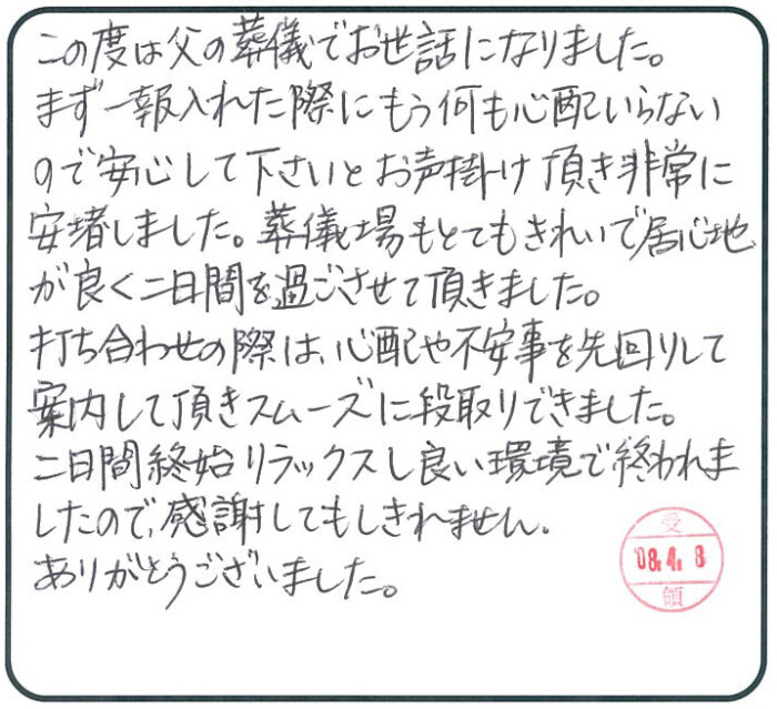 まず一報入れた際にもう何も心配いらないので安心して下さいとお声掛け頂き非常に安堵しました。葬儀場もとてもきれいで居心地が良く二日間を過ごさせて頂きました。打ち合わせの際は、心配や不安事を先回りして案内して頂きスムーズに段取りできました。二日間終始リラックスし良い環境で終われましたので、感謝してもしきれません。