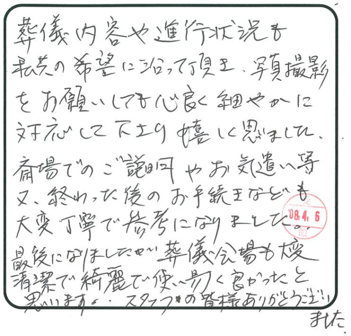 葬儀内容や進行状況も私共の希望に沿って頂き、写真撮影をお願いしても心良く細やかに対応して下さり嬉しく思いました。