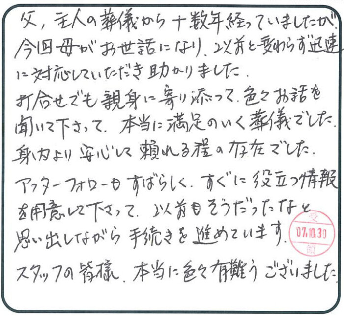 父、主人の葬儀から十数年経っていましたが、今回母がお世話になり、以前と変わらず迅速に対応していただき助かりました。