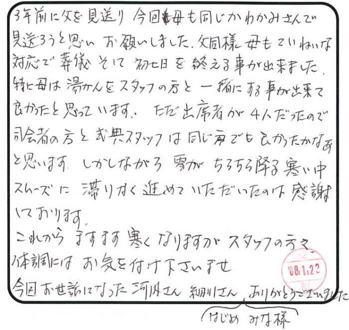 3年前に父を見送り、今回母も同じかわかみさんで見送ろうと思いお願いしました。