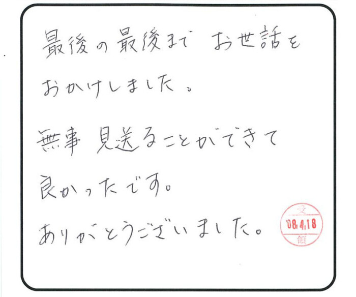 最後の最後までお世話をおかけました。無事、見送ることができて良かったです。
