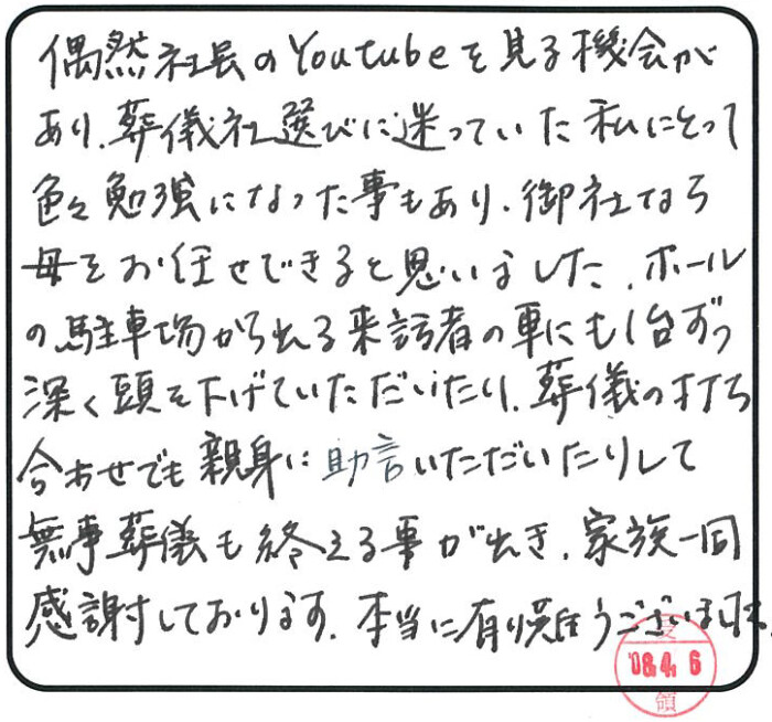 偶然 社長のYoutubeを見る機会があり、葬儀社選びに迷っていた私にとって色々勉強になった事もあり、御社なら母をお任せできると思いました。