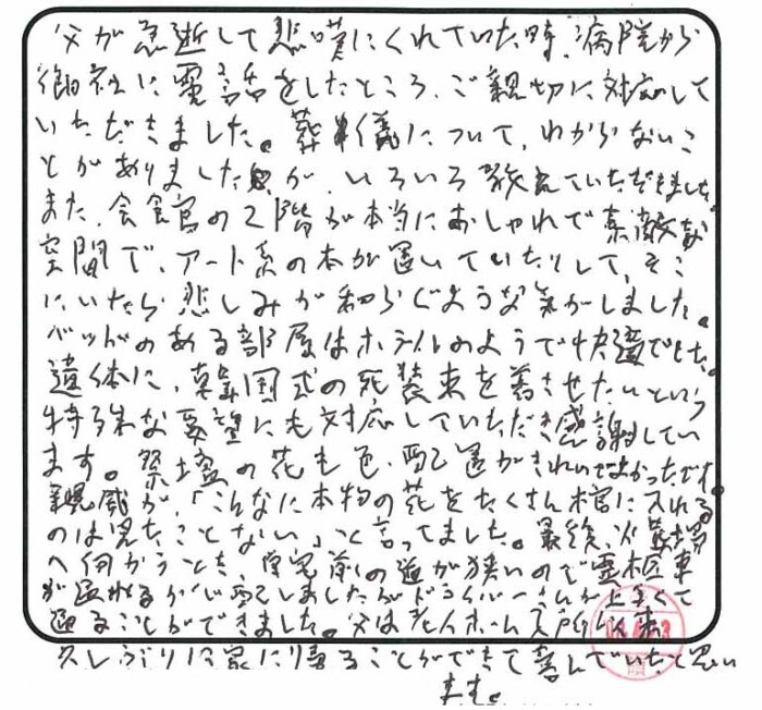 父が急逝して悲観にくれていた時、病院から御社に電話したところ、ご親切に対応していただきました。葬儀について、わからないことがありましたが、いろいろ教えていただきました。また、会館の2階が本当におしゃれで素敵な空間で、アート系の本が置いていたりして、そこにいたら悲しみが和らぐような気がしました。