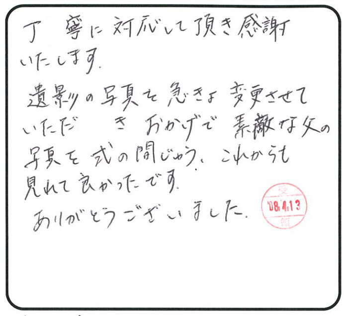 遺影の写真を急きょ変更させていただきおかげで素敵な父の写真を式の間じゅう、