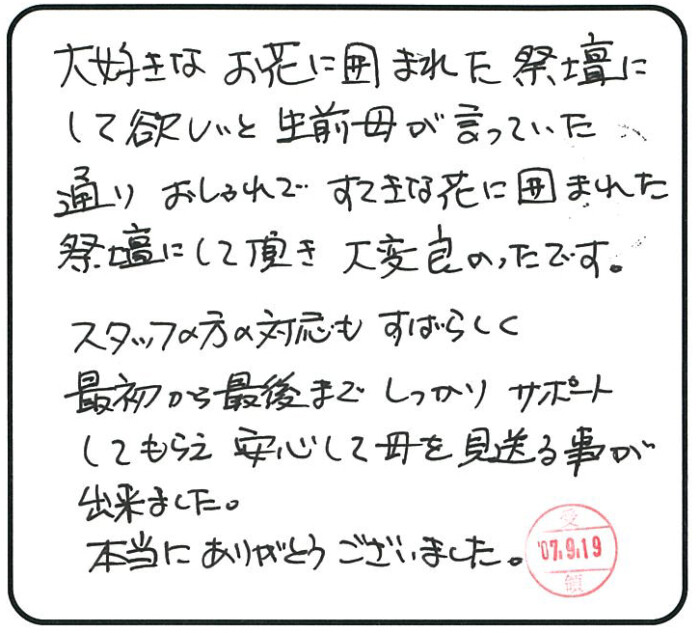 おしゃれですてきな花に囲まれた祭壇にして頂き 大変良かったです。